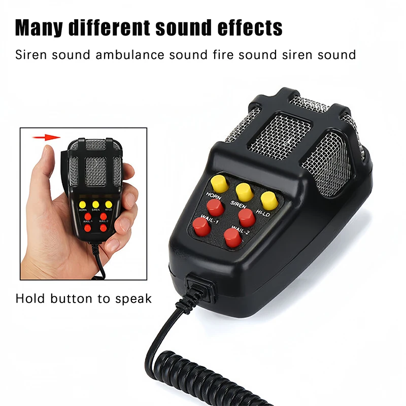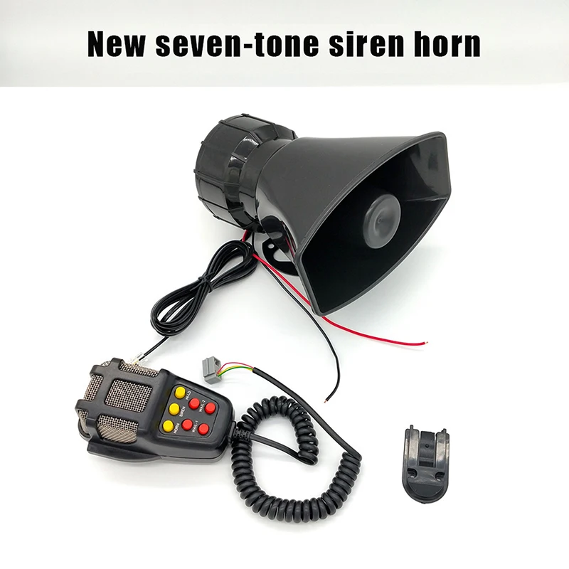 Powerful 7-tone electronic siren suitable for cars, motorcycles, and emergency vehicles. Features a loud 125dB output, 12V compatibility, built-in microphone, and durable loudspeaker for clear warning signals.